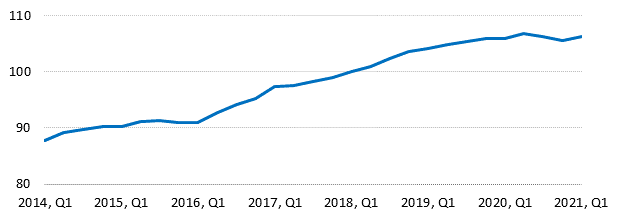 Chart 1. St Helena Retail Price Index Q1 2014 to Q1 2021 (Q1 2018=100)