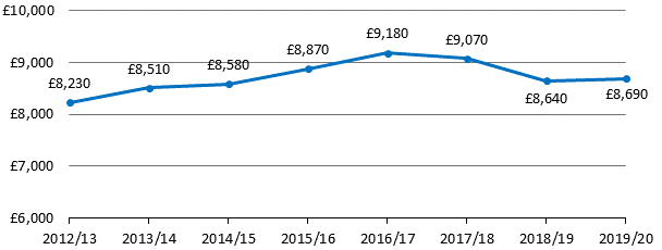 Chart 1. Median annual gross wages from full-time employment, 2012/13 to 2019/20, in constant 2019/20 prices (i.e. adjusted for price inflation)