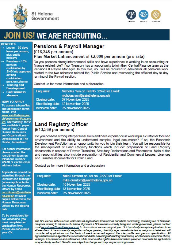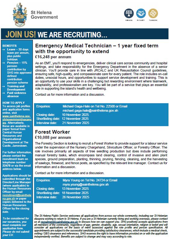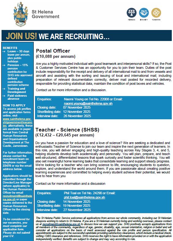 Further St Helena vacancies are advertised through Career Access St Helena https://www.sainthelena.gov.sh/cash/