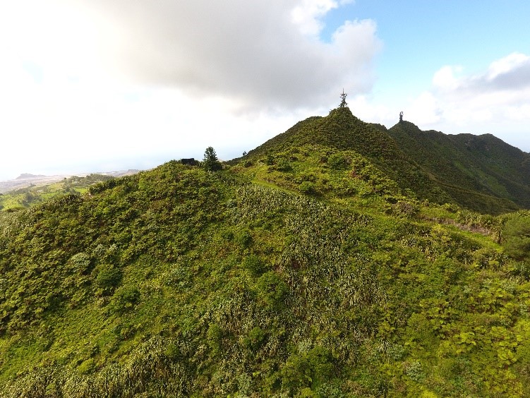View of the Peaks taken from a drone by Ross Henry from the Environmental Management Division’s Darwin Project funded team controlling invasive plants amongst the tiny fragments of remaining habitat where old cabbage trees survive.