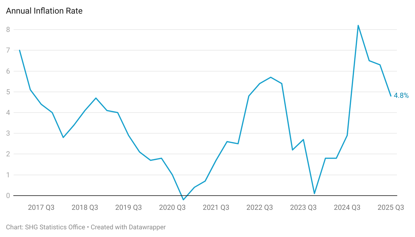 The latest estimate of the Consumer Price Index (CPI) has been released by the St Helena Statistics Office, for the third quarter of 2025 (Q3 2025). The CPI has been measured at 104.8, an increase of 1.2% on the previous quarter (Q2 2025) and a 4.8% increase compared to a year ago (Q3 2024). This annual inflation rate of 4.8% is a drop in the rate by 1.5 percentage points compared to the rate measured in Q2 2025, which was 6.3%.