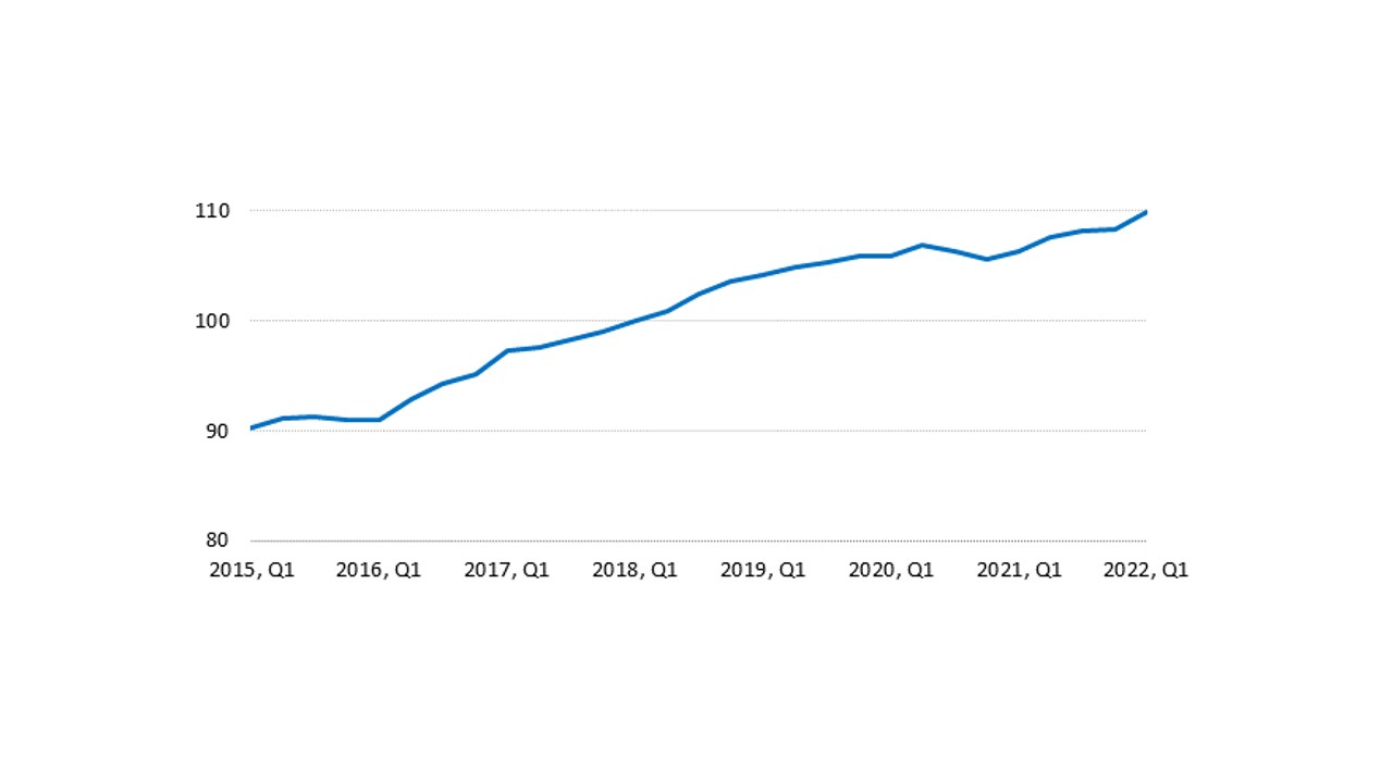 For the first quarter of 2022 the Retail Price Index (RPI) has been measured at 109.9 (Chart 1). This is an increase of 1.4% from three months ago. It is also an increase of 3.3% from a year ago, when the RPI was 106.3. This means that the annual inflation rate is 3.3%, comparing prices in the first quarter of 2022 to the same time period in 2021. This is the highest inflation has been since the beginning of 2019, pre COVID-19 pandemic.
