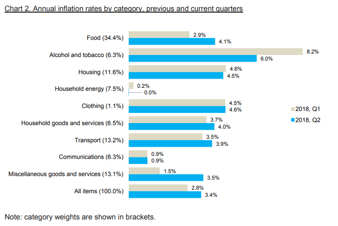 The category with the lowest annual inflation rate is ‘Household energy’, where prices at the end of quarter 2 2018 were unchanged compared to a year earlier. This is mostly due to unchanged prices for domestic electricity, which makes up over 85% of items in this group. Since the amount of electricity in the RPI is high (6.4%) based on average household expenditure patterns, this also has an impact on the overall inflation rate, offsetting some of the increases in other categories. ‘Communications’ also had a low annual inflation rate, at 0.9%.