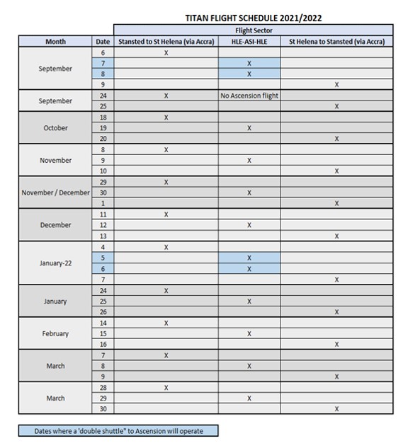 St Helena Government (SHG) recently announced the schedule of the Titan Airways Charter flights up until March 2022. This included additional flights during the peak season through November and December 2021 as well as double shuttle flights to Ascension Island.