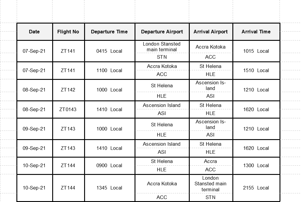 | 01 DEC 21 | ZT0144 | 0900 Local | St Helena HLE | Accra, Kotoka ACC | 1300 Local |