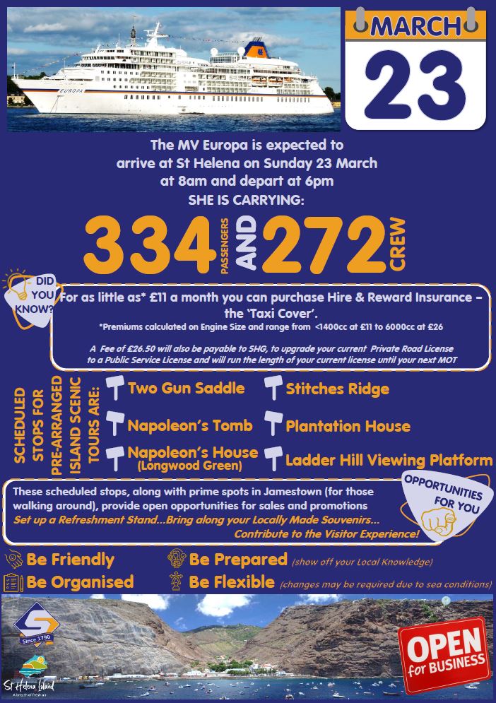 The cruise ship MV Europa will arrive in St Helena at 08:00 on Sunday, 23 March 2025. There are approximately 340 passengers on board.