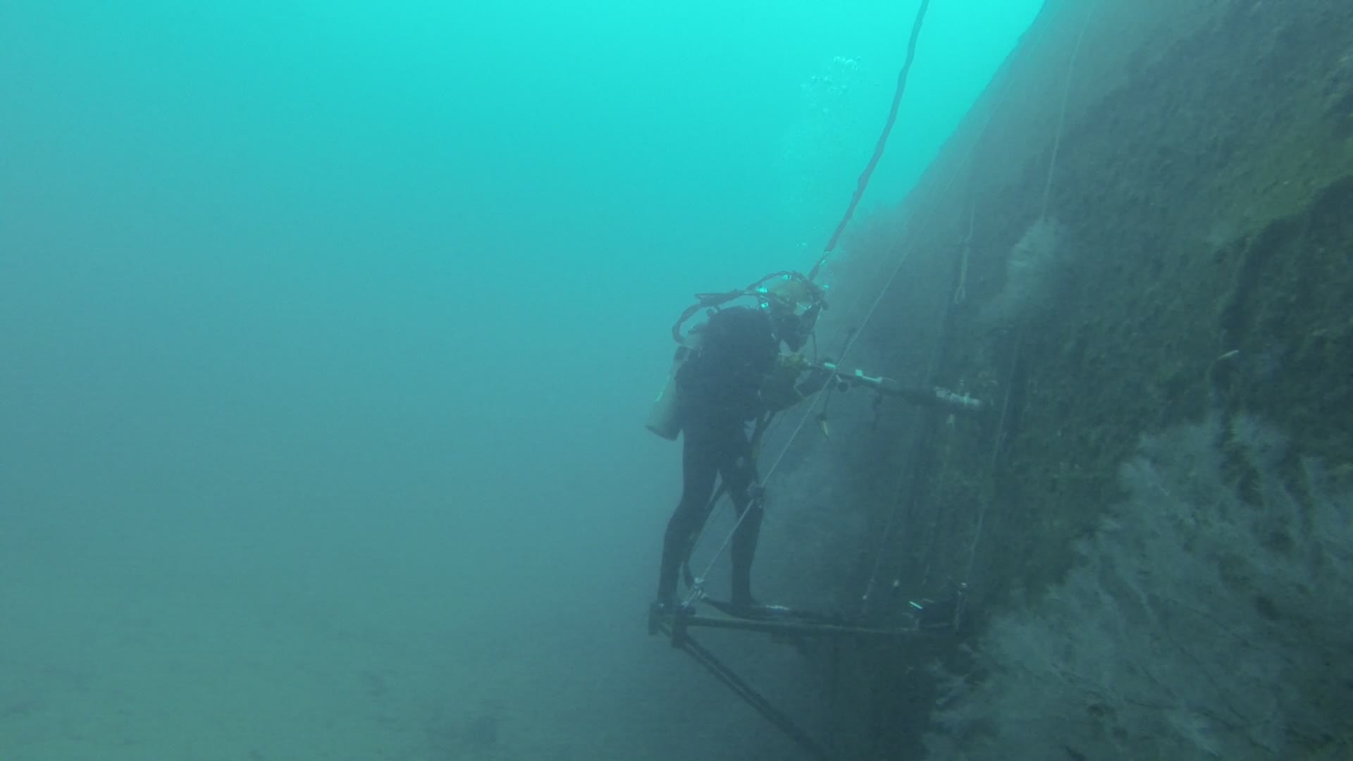 “As we have removed the oil and disturbed the wreck, there has been some minor oil leakage causing a sheen of oil on the surface, visible from the shore, which I realise has caused some concern. What we have found is that on the stern section of the wreck where the corrosion if thicker, there is a layer of oil trapped between the steel of the hull and the corrosion. This is oil that has slowly leaked out of the wreck over the past 74 years – but the corrosion has trapped it on the wreck. As we have cleaned the hull to allow us to install the valves, this oil has been released and come to the surface. But we have now completed all the work in this area, so we will not be disturbing this layer any further.
