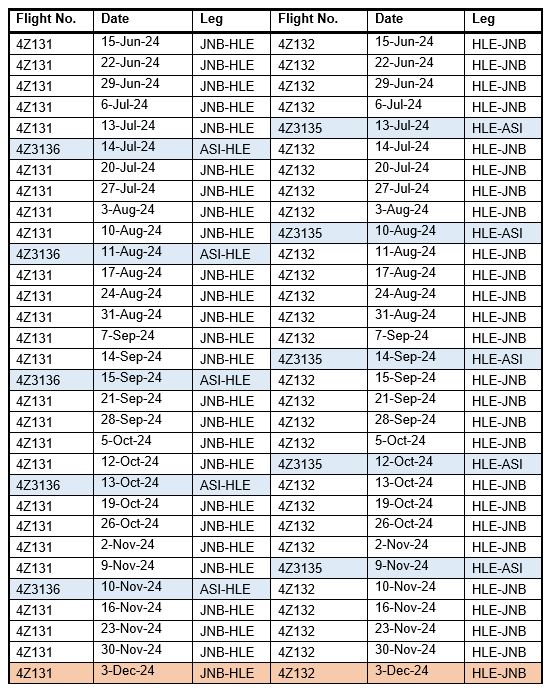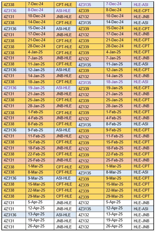 Airlink Flight Schedule South Africa – HLE – South Africa (including ASI) Jun 2024 – April 2025
