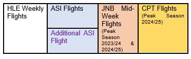 In November 2023 SHG announced the 2024-25 peak season mid-week flights (Tuesday Johannesburg flights) and the reintroduction of Cape Town flights (Saturday flights). Following assessment of the current and forecast demand for these flights and discussions with Airlink and the Foreign, Commonwealth, and Development Office (FCDO) it has been decided to remove the March 2025 Tuesday Johannesburg flights to maximise value from the air service.