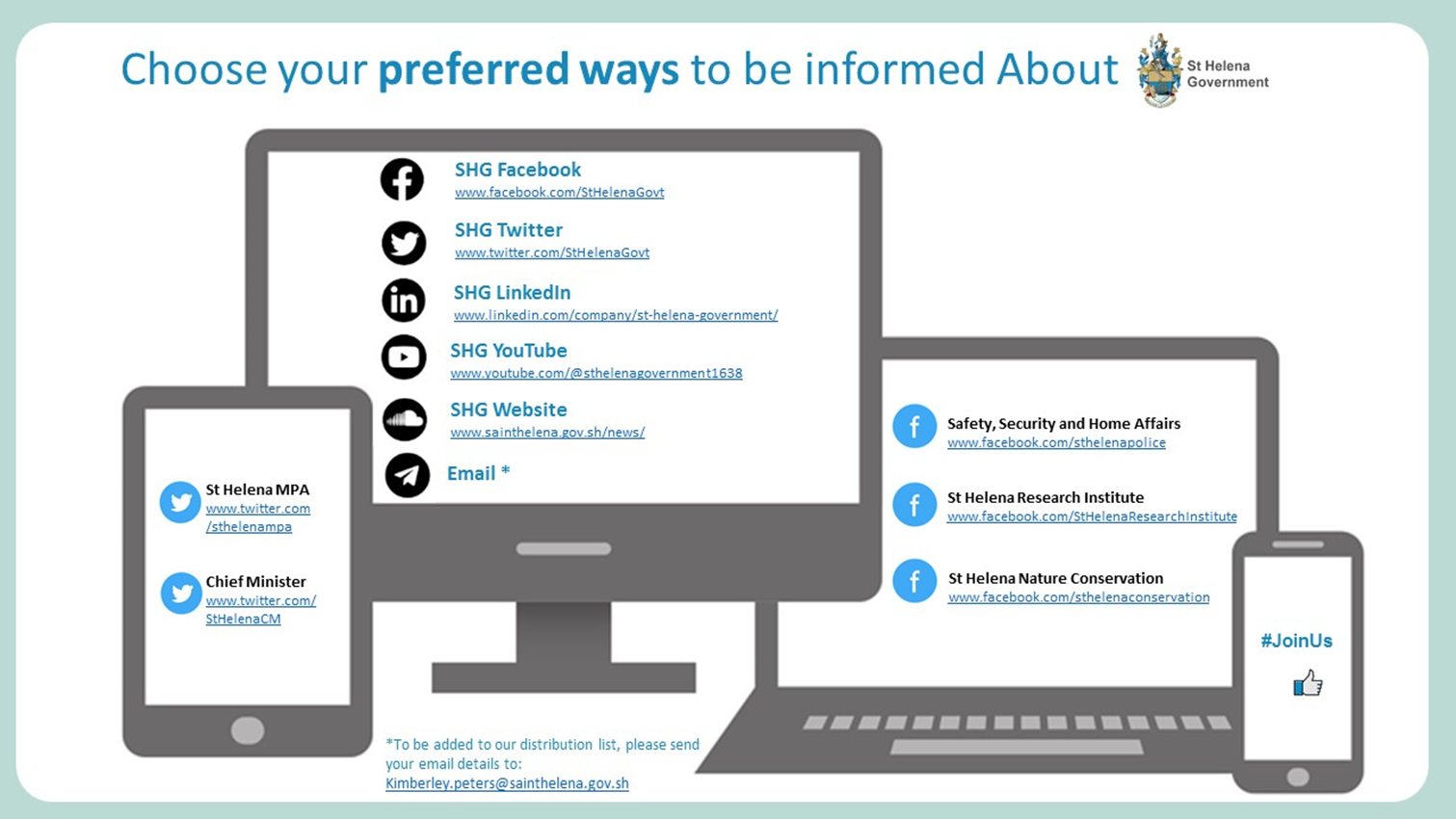 News, updates and communications from St Helena Government are available through a variety of communication channels. These options are designed to suit the habits and needs of the St Helena community, ensuring you can keep up-to-date and informed as you see fit.