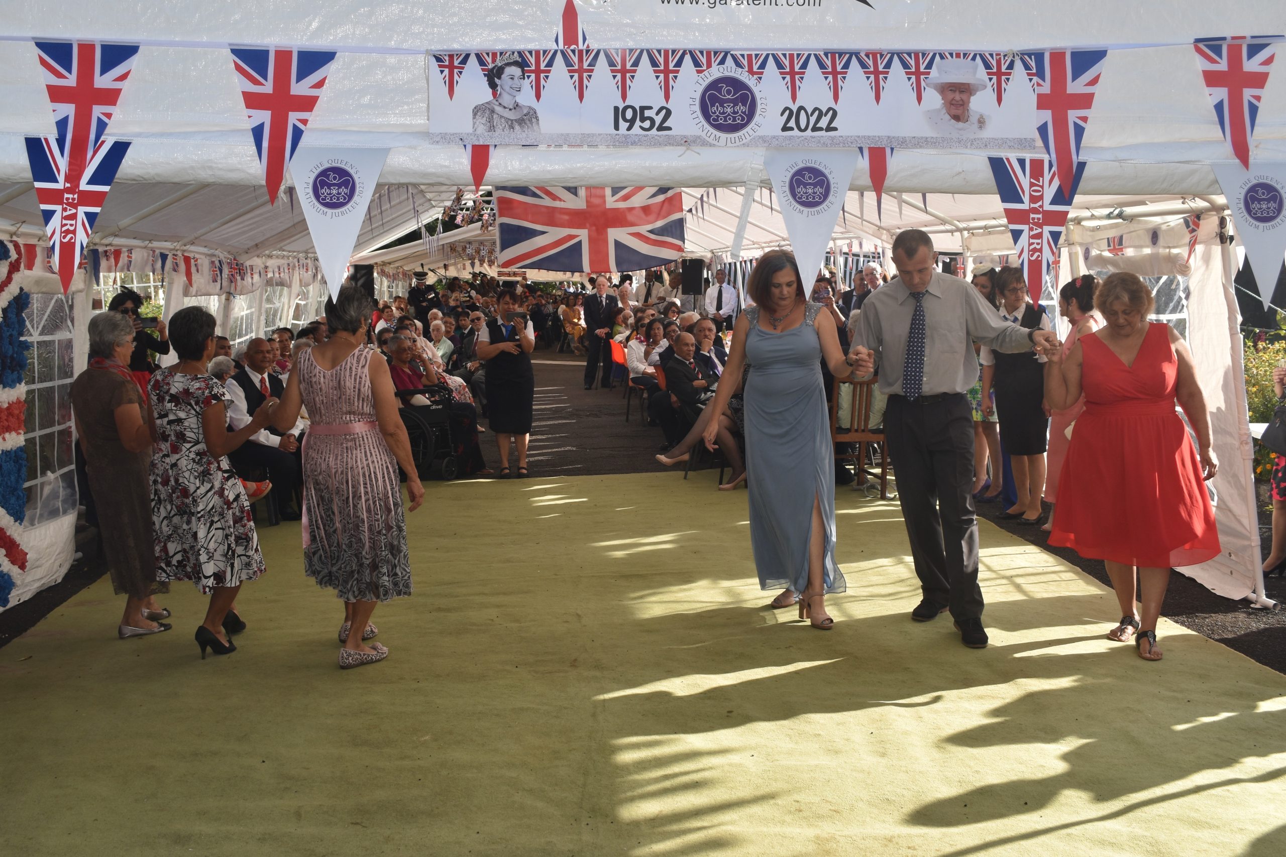 Later the Governor cut a Jubilee cake. This was followed by a dance display where dancers performed the quick step, palais glide, boston, and line dancing. Guests took the opportunity to join in with dancing the boston.