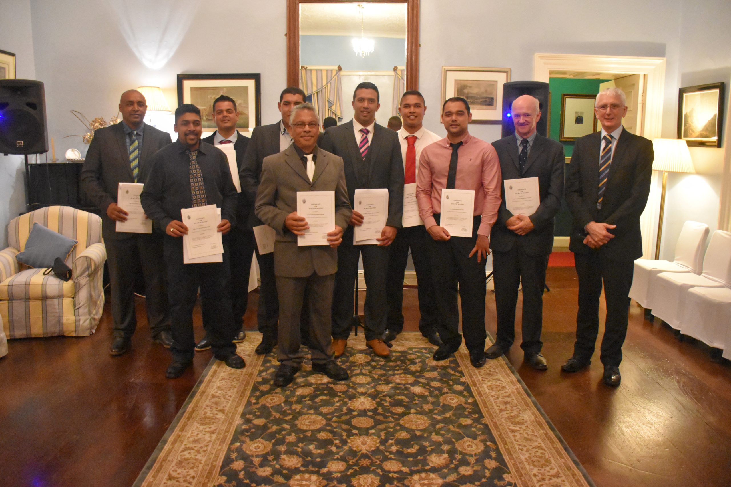 HE Governor also awarded an Act of Bravery Award and certificate to Alan Thomas, Damien Stevens, Yordie Constantine, Christopher Wade, Rhys Francis, Jason Lawrence, Matthew Benjamin and Christian Phillips of the St Helena Fire & Rescue Service, and Joe Hollins, Kenneth Henry and Rico Williams of the Veterinary Section for performing an act of bravery on 31 December 2020 by being instrumental in the difficult rescue of a dog whose life was in peril after falling onto a cliff ledge.
