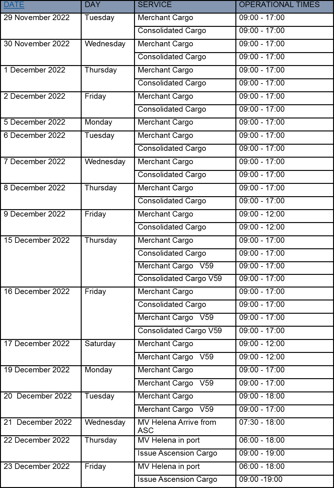 Due to the high volume of cargo that arrived on the MV Helena, Customs has extended their opening times to 17:00 hrs on cargo operation days.