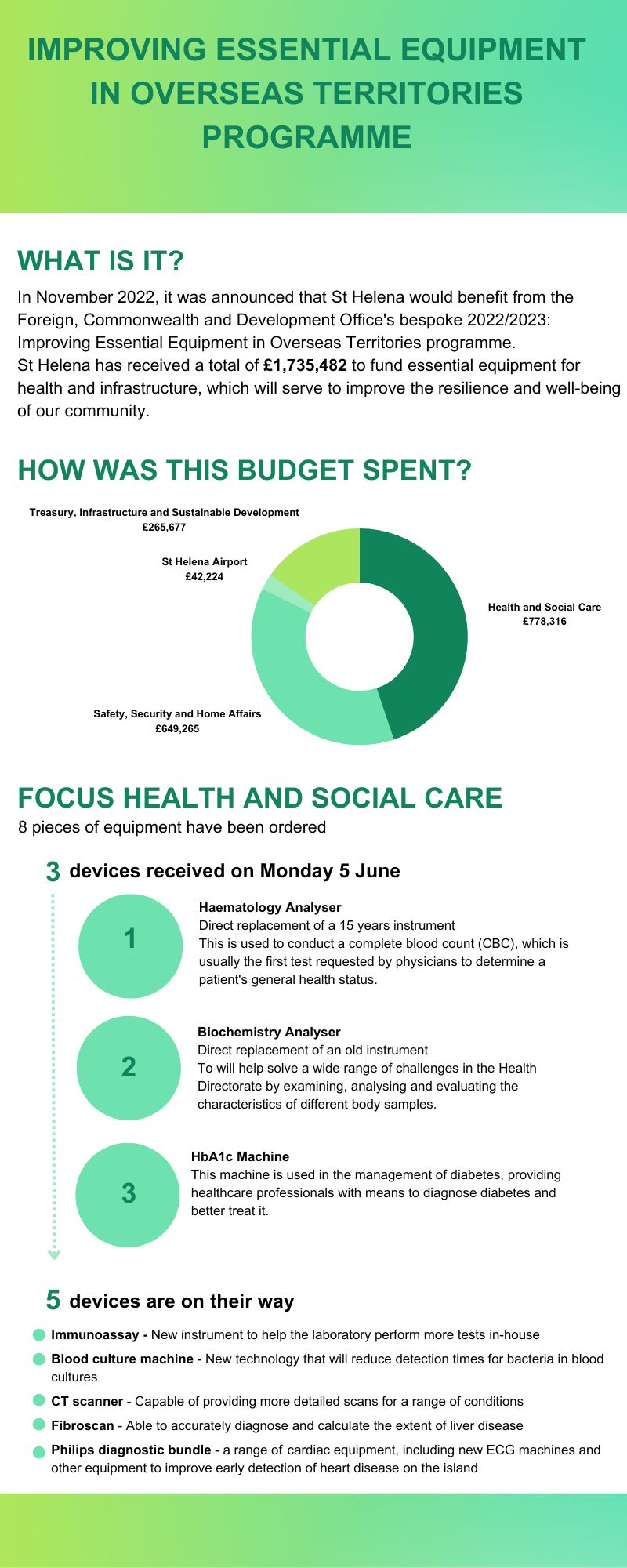 St Helena spent £1,735,482 on purchasing equipment of critical importance to the Island, in areas including health care, emergency services, port operations, road maintenance and the airport. The purpose is to improve the resilience and well-being of our community.