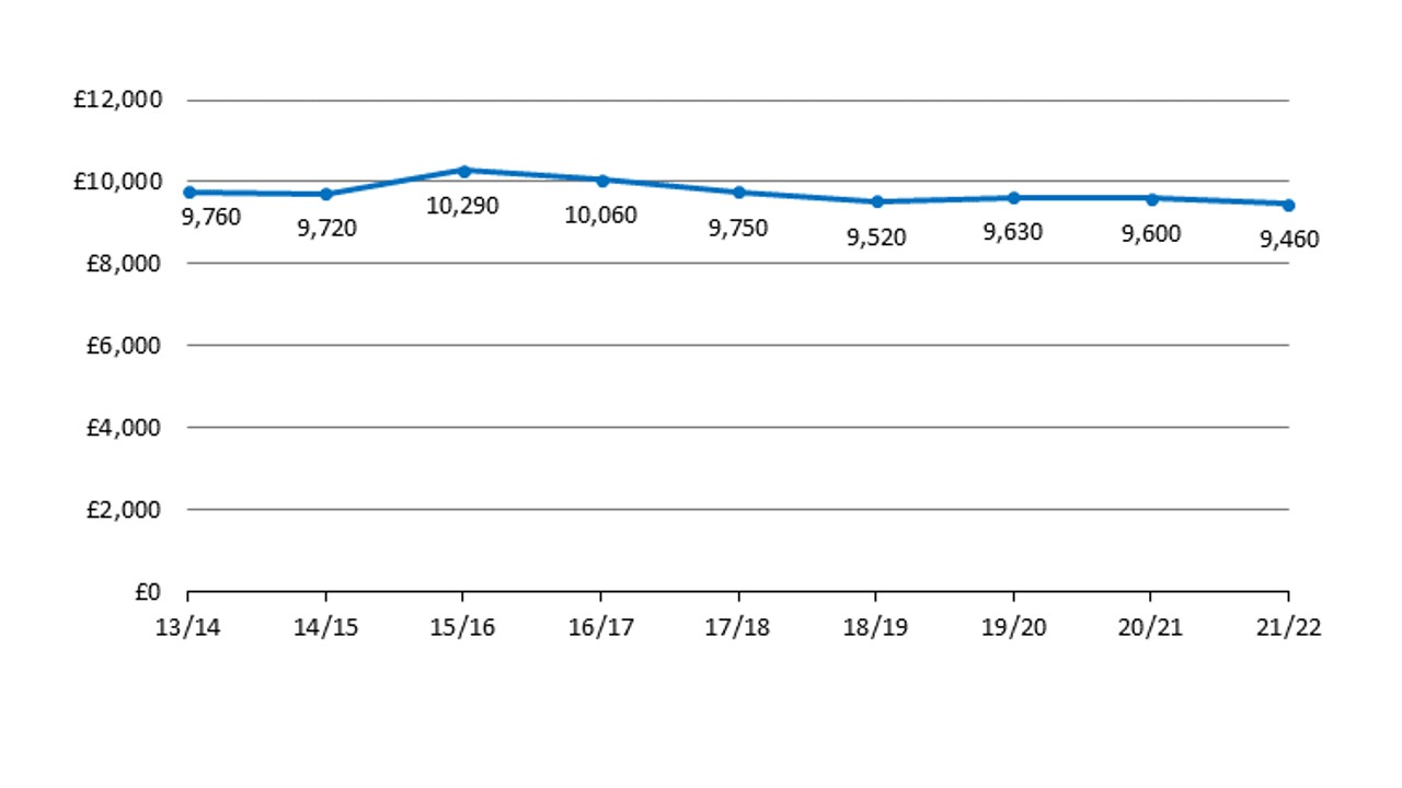 The median is the usual measure of average incomes or wages, because it is less sensitive than the mean to small numbers of relatively high wage earners in a population. A median wage level estimate of £9,460 means that, for 2021/22, half of all full-time employees had before-tax wages that were less than £9,460, and half had before-tax wages that were estimated to be higher.