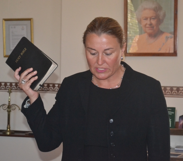 On Wednesday afternoon, 26 November 2014, Nicola Moore was sworn in as Attorney General for St Helena, taking the required Oaths necessary to serve on Executive and Legislative Councils, in the presence of Acting Governor Sean Burns. Two pictures are attached.