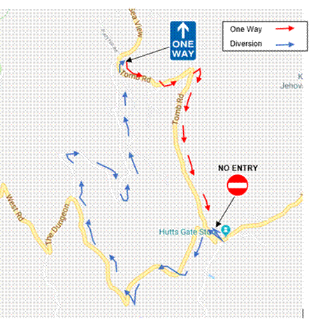 Traffic wishing to travel in the opposite direction will be diverted from Hutts Gate to Gordons Post via The Dungeon, as per the map below: