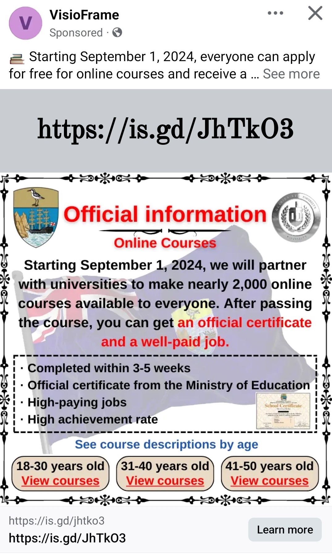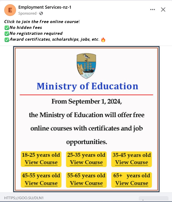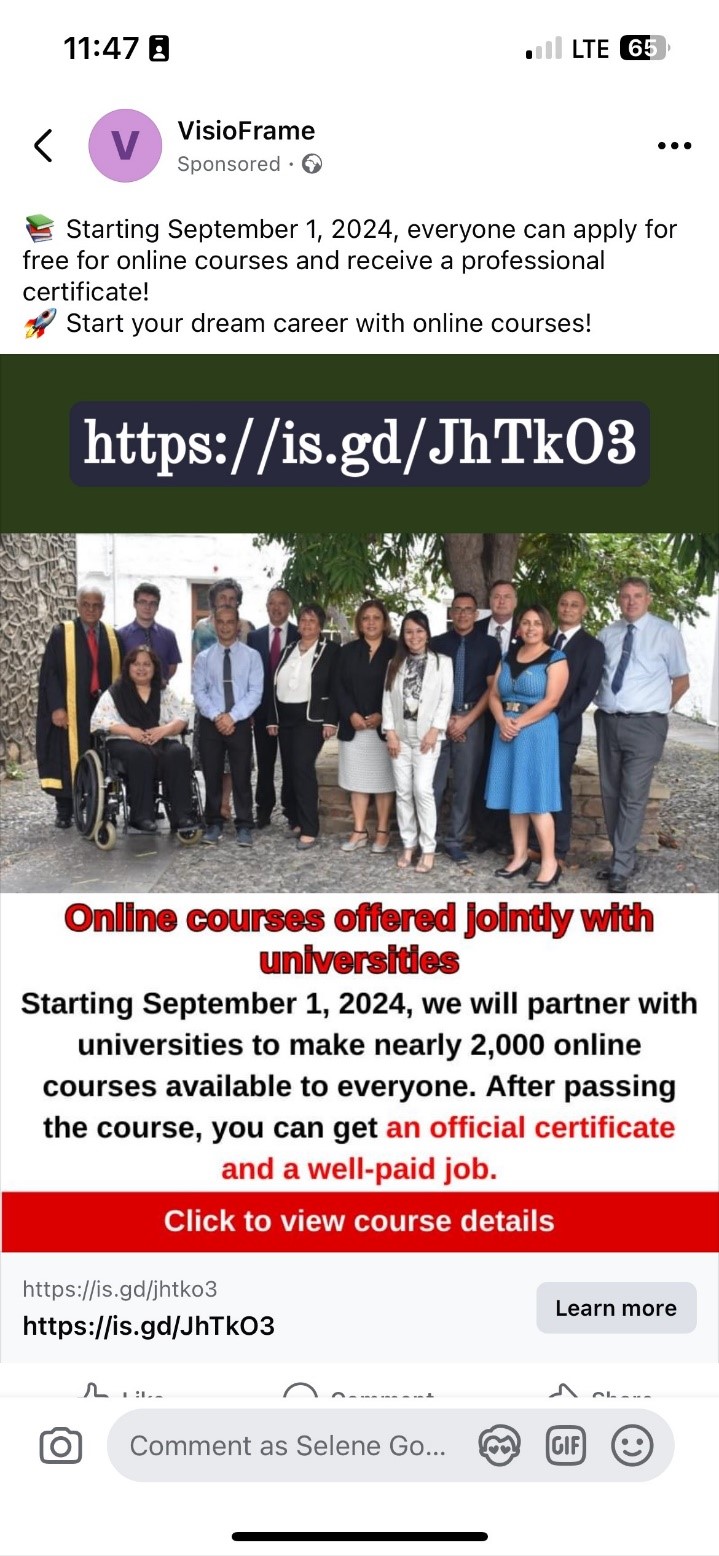 It has recently been brought to the attention of the Education, Skills and Employment Portfolio (ESE) that a number of Facebook posts have been identified by members of the public, advertising free online courses via the ‘Ministry of Education’ or ‘Online courses offered jointly with Universities’. These Facebook posts use images of the St Helena crest, St Helena flag and an image of members of Legislative and Executive Council along with the Speaker and Deputy Speaker.