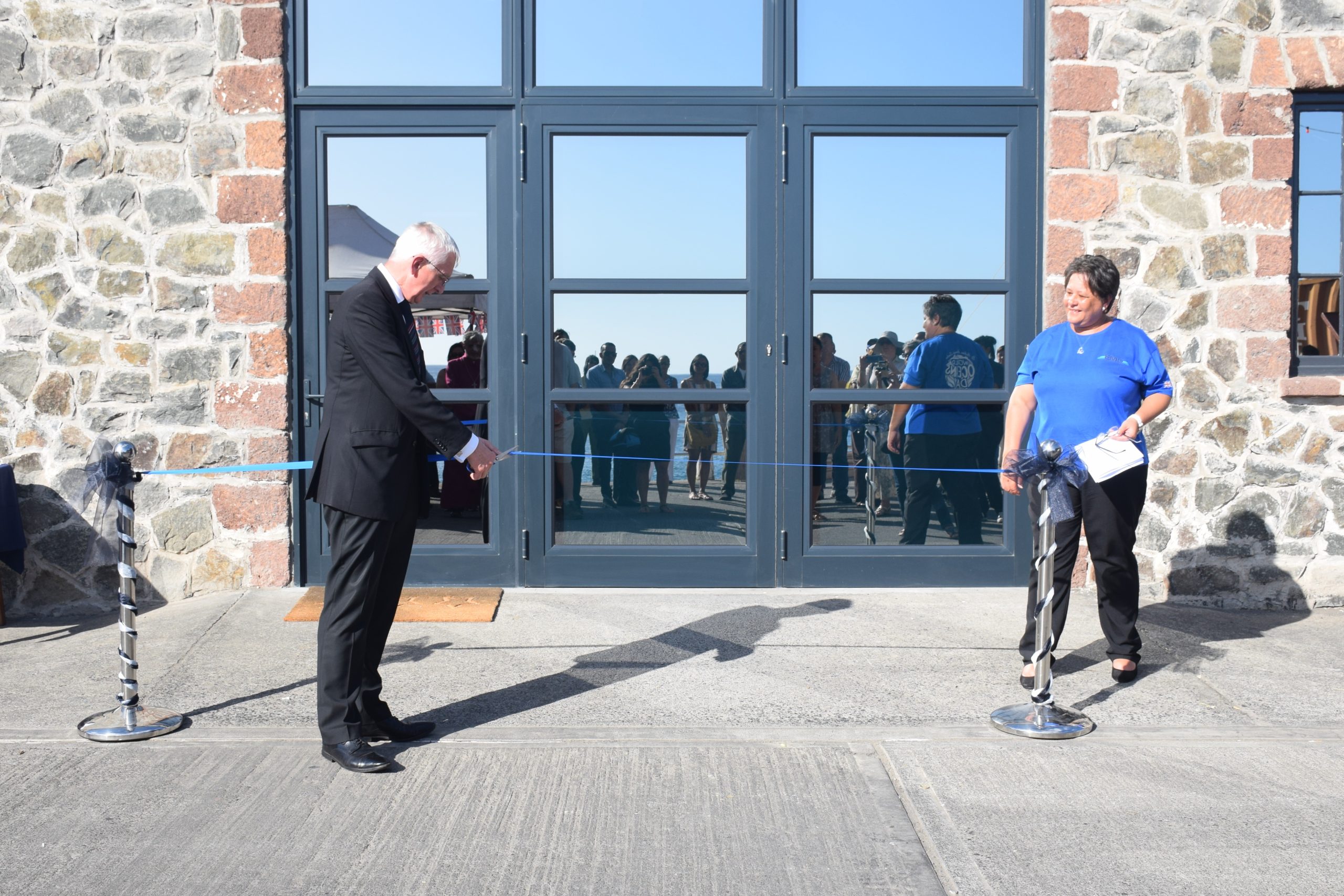 Minister Scipio and Blue Belt Manager, Elizabeth Clingham, unveiled the Marine Centre signboard and the Right Reverend Lord Bishop Dale Bowers MBE gave a blessing before the Governor declared the Marine Centre officially open with the cutting of the ribbon.