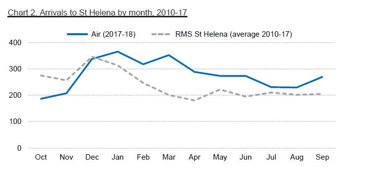 Chart 4 illustrates arrivals by air by month; the typical seasonal pattern of non-St Helenian tourists is quite pronounced, but the pattern of St Helenians arriving for holiday visits over the past year by air has been quite different, with the most popular month being July. This coincides with the UK summer holiday season, but it is also likely that many St Helenians abroad chose to use the RMS St Helena over the 17/18 Christmas period, while the service was still operating.