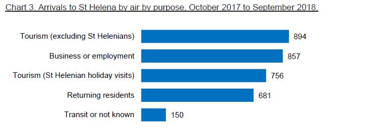 Around half of all arrivals by air were for tourism or holiday (1,650 people or 49%) and just under half were arrivals of returning residents or those coming for business or employment (1,538, or 46%). It should be noted that these figures do not include a full year of commercial air operations because the service started in the middle of October; for a full year (365 days) of commercial flights, the first two flights of October 2018 would need to be added.