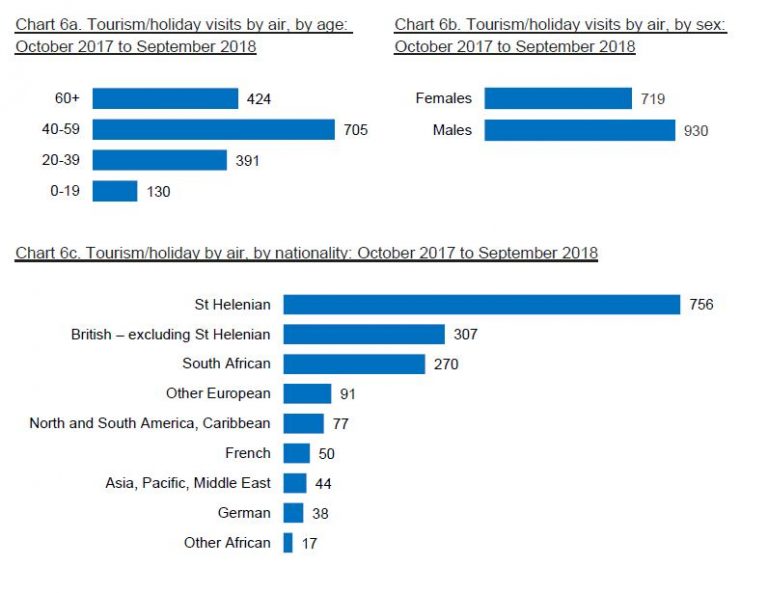 Charts 6a to 6c show various characteristics of tourism/holiday visitors that arrived by air in the last 12 months. There were slightly more men than women, and almost 70% were 40 or older. Apart from St Helenian, the most common nationalities were British, South African, and French (20%, 17% and 3% respectively).