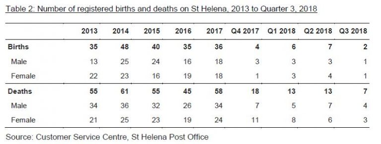 There were two births between July and September, the lowest quarterly number recorded since at least 2010. It brings the total number of births so far in 2018 to 15. There were seven deaths in the third quarter of 2018, which was also very low compared with recent trends. 33 deaths have been recorded to date in 2018 – more than double the number of births. Statistics on births and deaths are derived from records maintained by the Customer Service Centre, St Helena Post Office.
