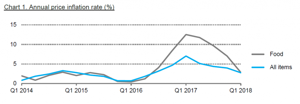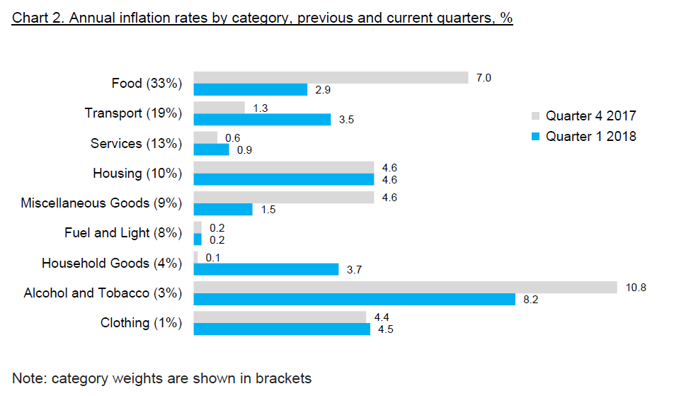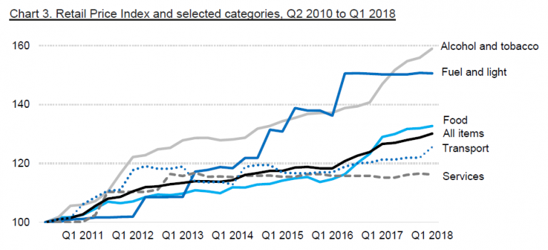 Categories with the lowest inflation are ‘Fuel and Light’ and ‘Services’ at 0.2% and 0.9% respectively. Apart from small fluctuations in the price of gas cylinders, prices of items in this category have seen very little change; 80% of the category is electricity, whose price has not changed since Quarter 1 2016 (petrol and diesel is included in the ‘Transport’ category). The ‘Services’ category includes medical and telecommunications fees and charges; some telecommunications fees have decreased, and any impact on the RPI of the increase in medical fees announced at the beginning of April will be captured in the second quarter.