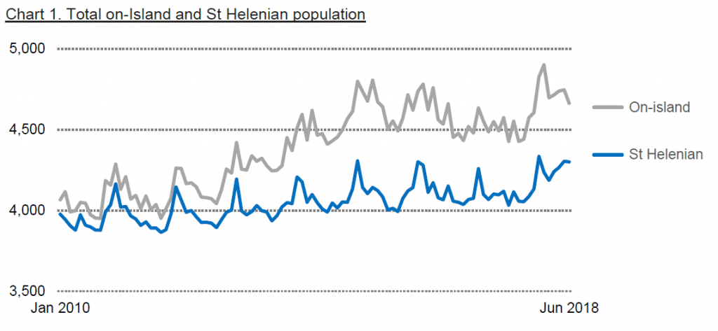 At the end of June 2018 the number of St Helenians on St Helena was estimated to be 4,300, almost 7% higher than at the end of June 2017, and very close to the peak number of 4,334 recorded at the end of December 2017. The estimated number of persons on St Helena, residents plus visitors, was 4,663, is a slight decrease compared to the end of March 2018, but a 5.3% annual increase compared to the end of June 2017.
