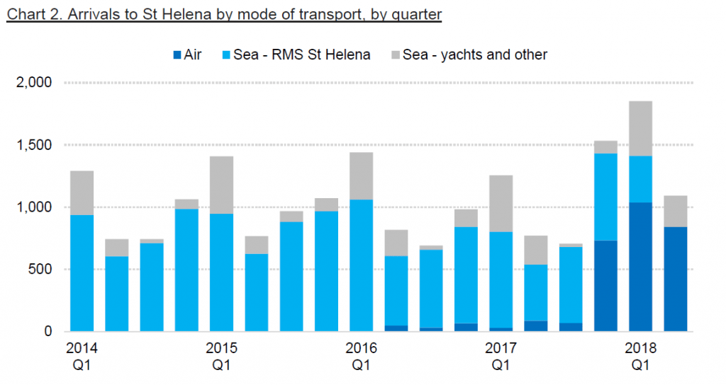 The total number of arrivals for the second quarter of 2018 was estimated to be 1,093 (see Table 1). This is much lower than the 1,852 arrivals in the first quarter, when both the new scheduled air service and the RMS St Helena were operating. However compared to a year ago, when there were 770 arrivals in the second quarter, it is a significant increase of 323 people or more than 40%.
