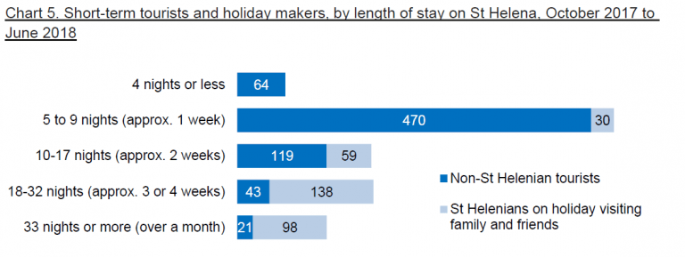 Even though the number of tourists arriving on St Helena was greater than the number of St Helenians arriving for a holiday to visit family and friends, the total number of nights they stayed on the island was less. This is because, on average, visiting St Helenians tend to stay longer than those visiting for tourism purposes (Chart 5).