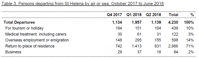 The total number of departures for the second quarter of 2018 was 1,139, substantially less than the first quarter (1,957) but about the same as the fourth quarter of 2017. This reflects the typical observed seasonal pattern, when St Helenians visiting for the Christmas period return in the first quarter of the year. Just over two–thirds of all departures were people returning to their usual place of residence. Some 14% were people who left to take up an overseas employment opportunity or to emigrate, and a further 10% were residents of St Helena departing for a holiday (see Table 3).