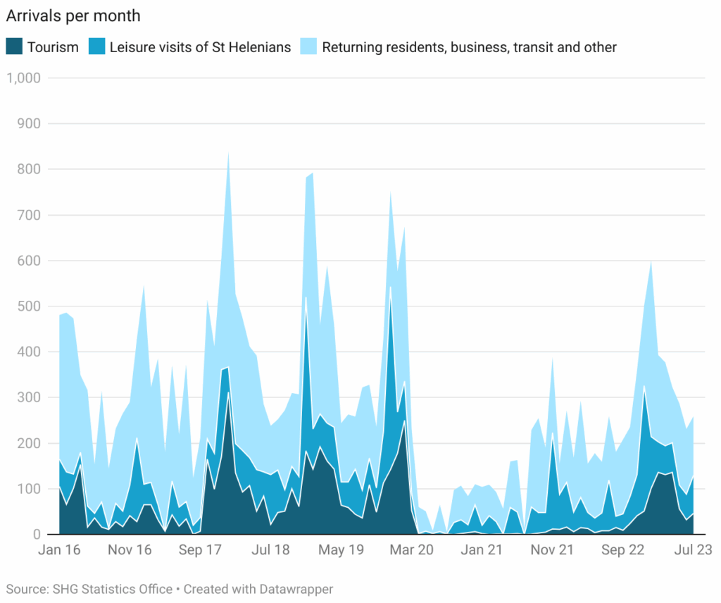 In July 2023, there were a total of 259 arrivals, the same number of arrivals compared to the same period in 2022. Of these July 2023 arrivals, 251 arrived by air and the remaining 8 by sea. 129 people arrived for leisure, including 46 non-St Helenians, and 83 St Helenians visiting family and friends on the island.