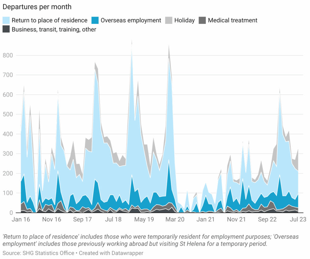 There were an estimated 326 departures in July 2023, 67 more than the number of arrivals. Of these, 316 left by air and the remaining 10 by sea. Compared to the same month a year ago this is an increase of 60 departures, or 23%.