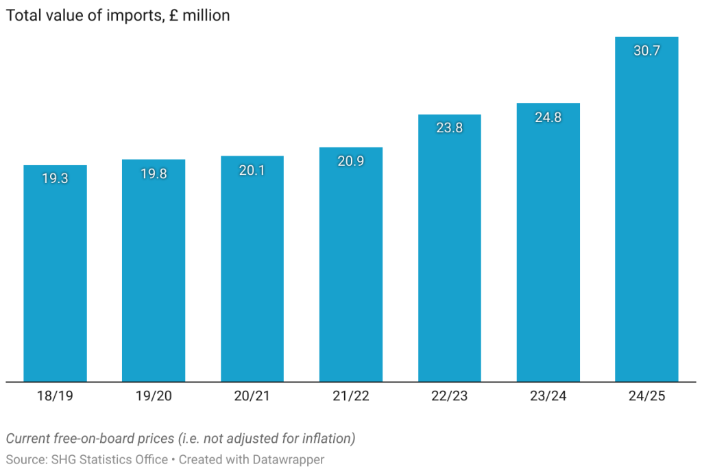 The total value of goods imported to St Helena during the 2024/25 financial year is estimated to be £30.7 million, an increase of £5.9 million compared to the previous year, or 23.8%.