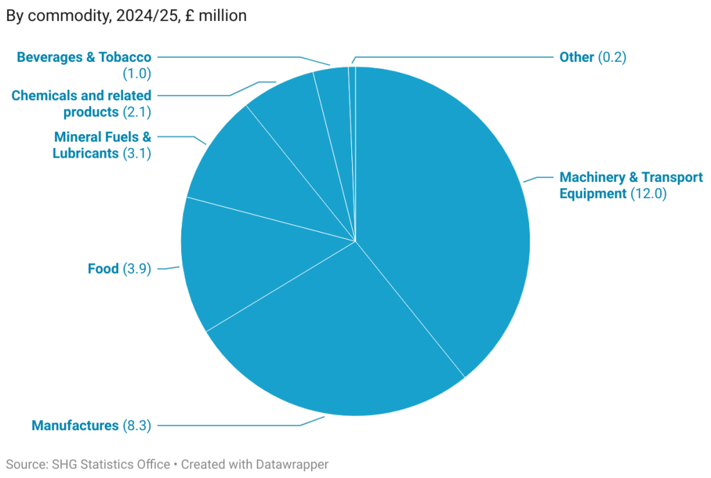Goods imported to St Helena predominantly fall into one of four major groups: machinery and transport equipment, manufactured goods and articles, food, and mineral fuel and lubricants. Diesel fuel, which is used in St Helena’s electricity power station, is typically among the largest single items each year, arriving by fuel tanker in regular consignments. In 2024/25 there was a large increase in the value of machinery and transport equipment, resulting from investments in transport and communications infrastructure.