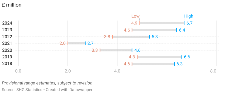 Exports of St Helena have historically been thought of in terms of goods, such as fish, coffee, and stamps. However spending by visitors to the island is also an export: exports are purchases by non-residents of St Helena of both goods and services. Visitor expenditure far exceeds the value of goods exports, but estimates are not precise and so are given as a range to indicate the level of uncertainty. In 2024, visitors to St Helena are estimated to have spent between £4.9 and £6.7 million (note that the values in the chart and given in current prices, i.e. not adjusted for inflation).