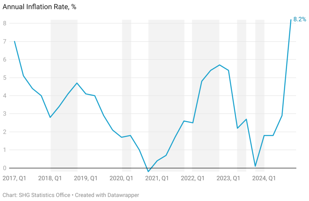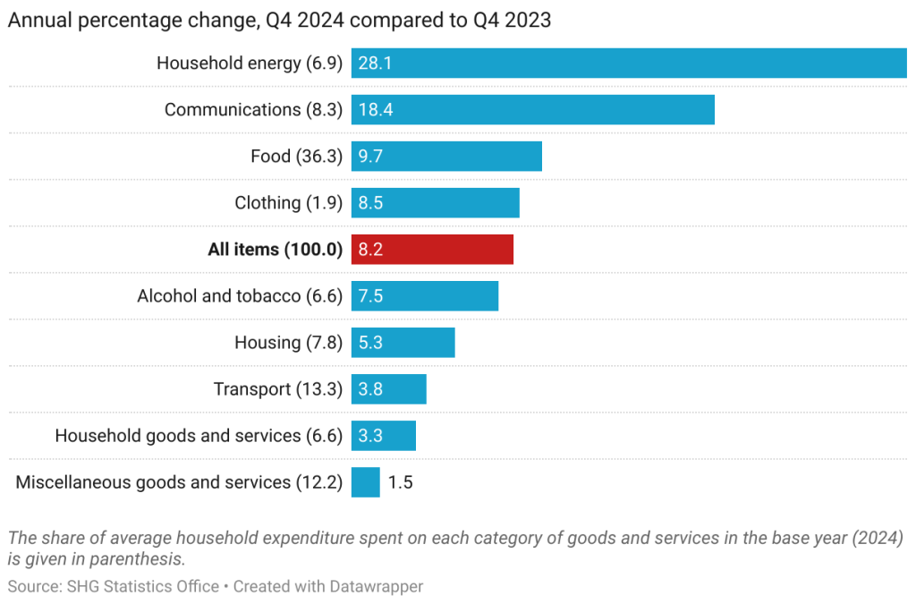 The Statistics Office has released new estimates of the Consumer Price Index (CPI) and the annual inflation rate. For the fourth quarter of 2024 the CPI has been measured at 103.1; in Q4 2023 the CPI was 95.3, which results in an annual inflation rate of 8.2%. This is much higher than the annual rate for Q3 2024 (which was 2.9%), and is the highest annual rate since 2009.