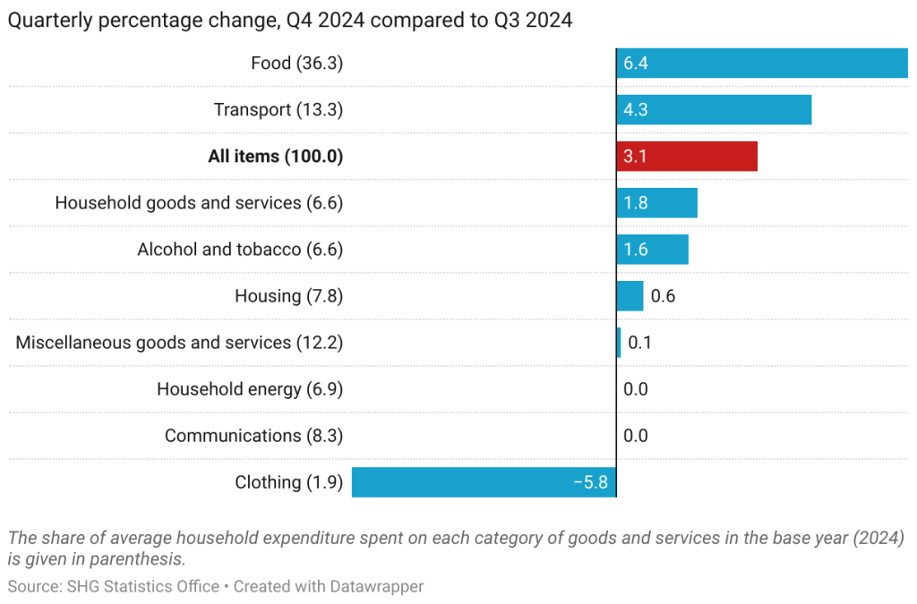 The quarterly change in the CPI was 3.1%, comparing Q4 2024 to Q3 2024. All groups of categories experienced average increases since the last quarter, apart from the Clothing, Communications, and Household Energy groups (due to their nature, clothing items tend to change frequently, depending on stock and demand). The groups with the highest quarterly increases were Food (6.4%) and Transport (4.3%), the consequence of an increase in the prices of goods and services, especially bread, meat, and the public bus service.