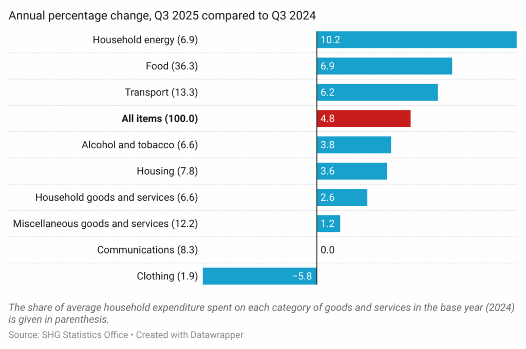All broad groups of items in the Index saw their prices rise, on average, compared to a year ago, apart from the Clothing category. The highest average annual increase was in Household Energy (10.2%), the result of changes to the electricity tariff implemented on 1 July 2025. There was an average annual increase in Food prices of 6.9%, which is similar to the level of annual food price inflation measured in Q2, which included the increase in the price of bread and meat in Q4 2024. Transport prices also increased on average by 6.2%, with increases in items that represent the cost of passenger road transport. The annual rate of price inflation for Communications was previously measured at 18.4% in Q2, but this is now zero because it has been more that a year since the revised tariffs for land line telephones and mobile phones took effect.