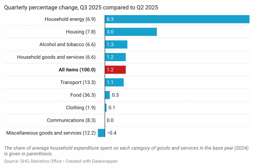 The quarterly change in the CPI was 1.2%, comparing Q3 2025 to Q2 2025. All categories experienced average increases since the last quarter, apart from Miscellaneous Goods and Services (-1.4%). Household Energy and Housing saw the largest increase between the quarters, a result of the changes to the tariffs for both water and electricity introduced at the beginning of Q3 2025 by Connect St Helena Ltd. Alcohol and Tobacco (1.3%) and Household Goods and Services (1.2%) also went up on average, due to changes in the price of tobacco-based products, and increases in the minimum wage respectively.