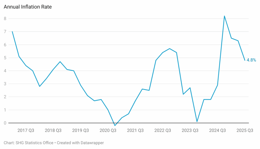The latest estimate of the Consumer Price Index (CPI) has been released by the St Helena Statistics Office, for the third quarter of 2025 (Q3 2025). The CPI has been measured at 104.8, an increase of 1.2% on the previous quarter (Q2 2025) and a 4.8% increase compared to a year ago (Q3 2024). This annual inflation rate of 4.8% is a drop in the rate by 1.5 percentage points compared to the rate measured in Q2 2025, which was 6.3%.