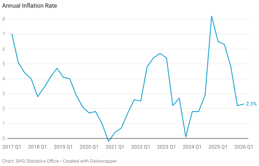 The latest estimate of the Consumer Price Index (CPI) has been released by the St Helena Statistics Office, for the first quarter of 2026 (Q1 2026). The CPI has been measured at 105.9, a small increase of 0.5% on the previous quarter (Q4 2025) and a 2.3% increase compared to a year ago (Q1 2025). This annual inflation rate of 2.3% is an increase in the rate of 0.1 percentage points compared to the rate measured in Q4 2025, which was 2.2%.