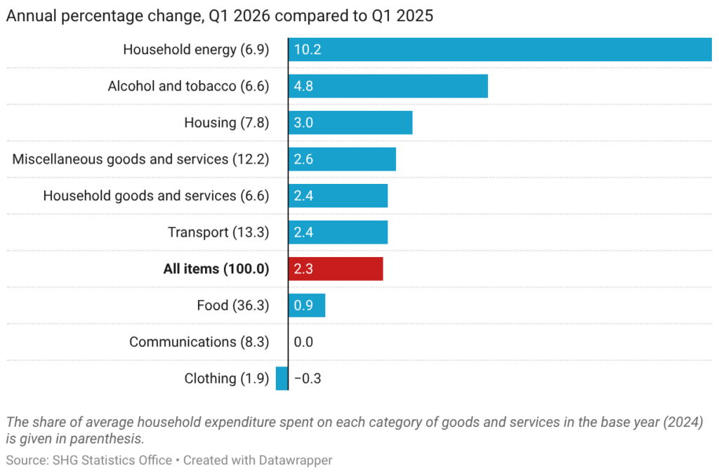 Almost all groups of representative items saw their average prices rise compared to a year ago, apart from Clothing. The highest average annual increase was in Household Energy (10.2%), which is the result of increases to the Electricity tariffs introduced in July 2025. Electricity is the highest weighted individual commodity in the current basket, therefore price changes to this item have a significant impact on the overall annual inflation rate. Alcohol and Tobacco increased by 4.8% during the year between Q1 2025 and Q1 2026, driven mainly by increases in the price of tobacco and wine products (duty rates on alcohol and tobacco imports are increased by more than the rate of inflation each year).