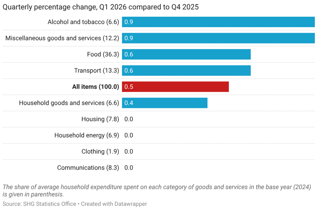 The quarterly change in the CPI was 0.5%, comparing the index value in Q4 2025 to its value in Q1 2026. All categories experienced average increases in prices since the last quarter; Alcohol and Tobacco rose by 0.9%, a result of increases to Tobacco products during the quarter, and Miscellaneous Goods and Services also rose by 0.9%, resulting from increases in common household supplies, including toilet rolls. Household Goods and Services and Food both rose by 0.6% during the quarter, with the change in the Food category attributed to a combination of small price changes in some food items with high weights in the basket, like imported meats and dairy products.