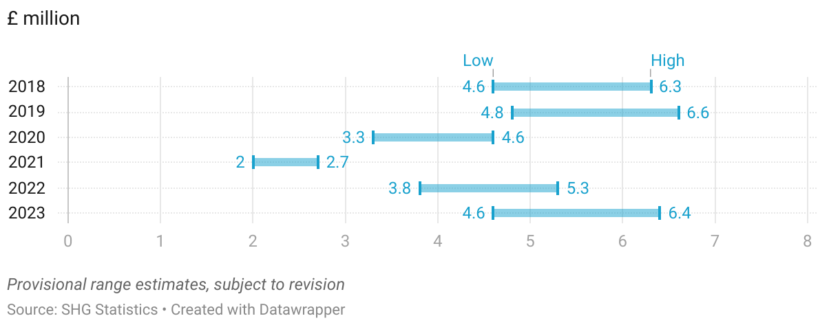 The Statistics Office has released new provisional range estimates of the expenditure of visitors for 2023, of between £4.6 and £6.4 million. This is roughly the same as in 2018, and only slightly lower than 2019, the year directly before the COVID-19 pandemic, which was between £4.8 and £6.6 million.