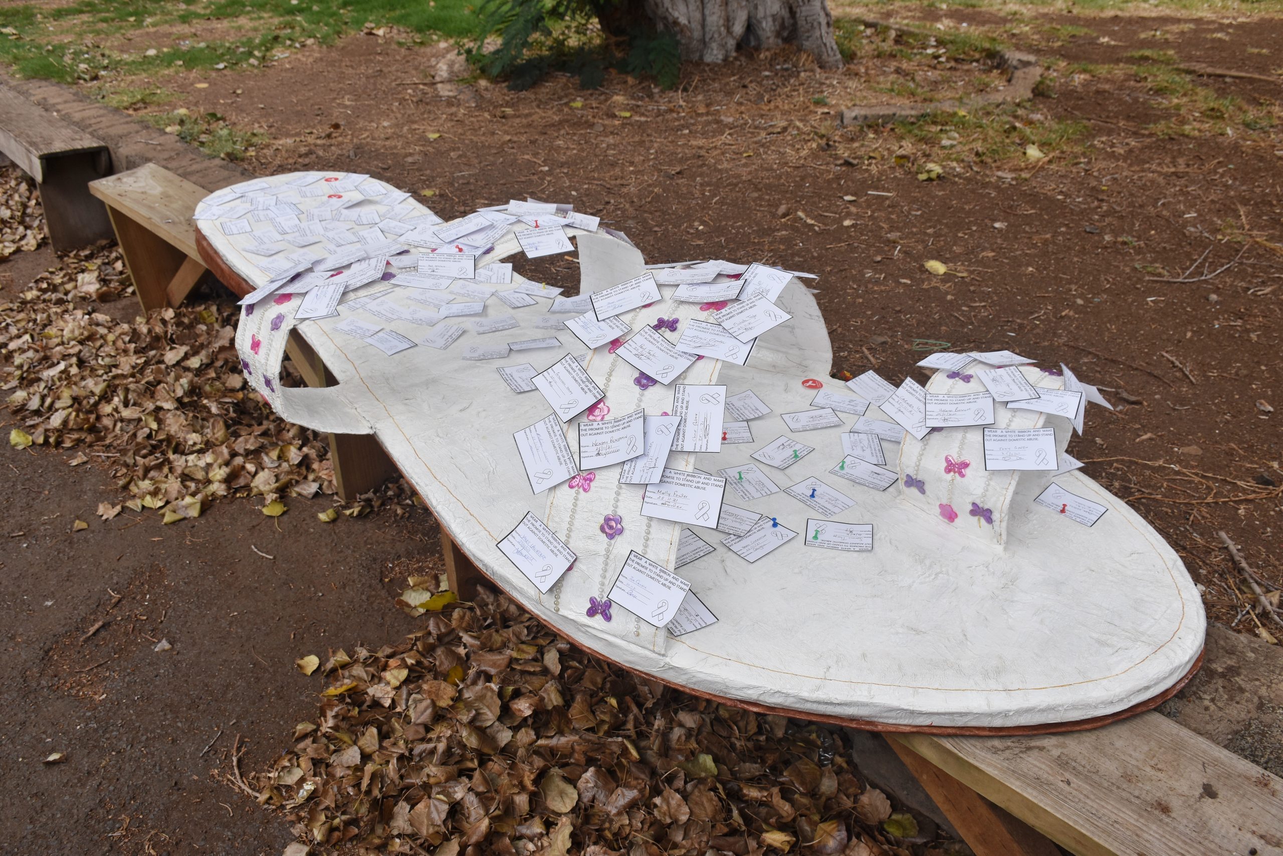 The White Ribbon Campaign 2021 commenced on Thursday, 18 November, and included awareness raising through radio interviews, the private sector, staff of St Helena Government (SHG) and Non-Government Organisations wearing white ribbons (the symbol of anti-violence), persons signing pledges to ‘Stand up and Speak out’ against Domestic Abuse and pinning them to large cardboard cut-outs in the shape of a ladies shoe, displaying and lighting Wooden White Ribbon Images at various locations in Jamestown in honour of survivors and victims of domestic abuse, footballers wearing white ribbons before their matches and also signing pledges. A White Ribbon Campaign stall set up at the Post Office, and leaflets on Domestic Abuse were also available for the public.